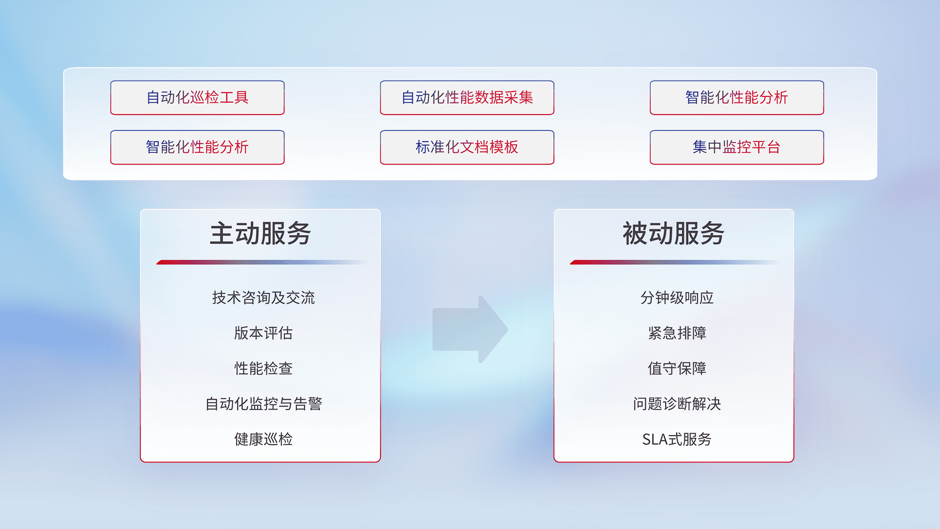 智能化工具和标准化文档,,,,保障服务质量,,,,提供主动服务(包含技术咨询、、、、版本评估、、性能检查、、、、自动化监控与告警、、健康巡检)和被动服务包含(分钟级响应、、、、紧急排障、、、、值守保障、、、、问题诊断解决、、、SLA服务)。。。
