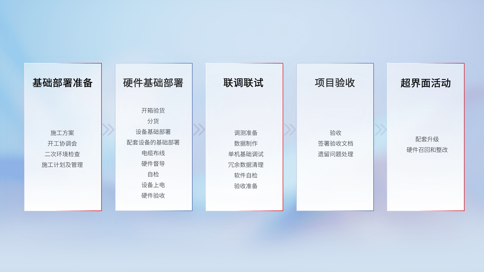从基础部署准备、、、、硬件基础部署、、联调联试、、、、项目验收、、、越界面活动的全过程可追溯,,,保证施工质量和进度。。。。